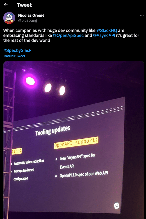 Then, the tipping point happened. My friend Nico sent a tweet from the Spec by Slack conference. He posted a picture of the screen where Slack engineers were presenting, and right there, they mentioned they were adopting a new specification called AsyncAPI.