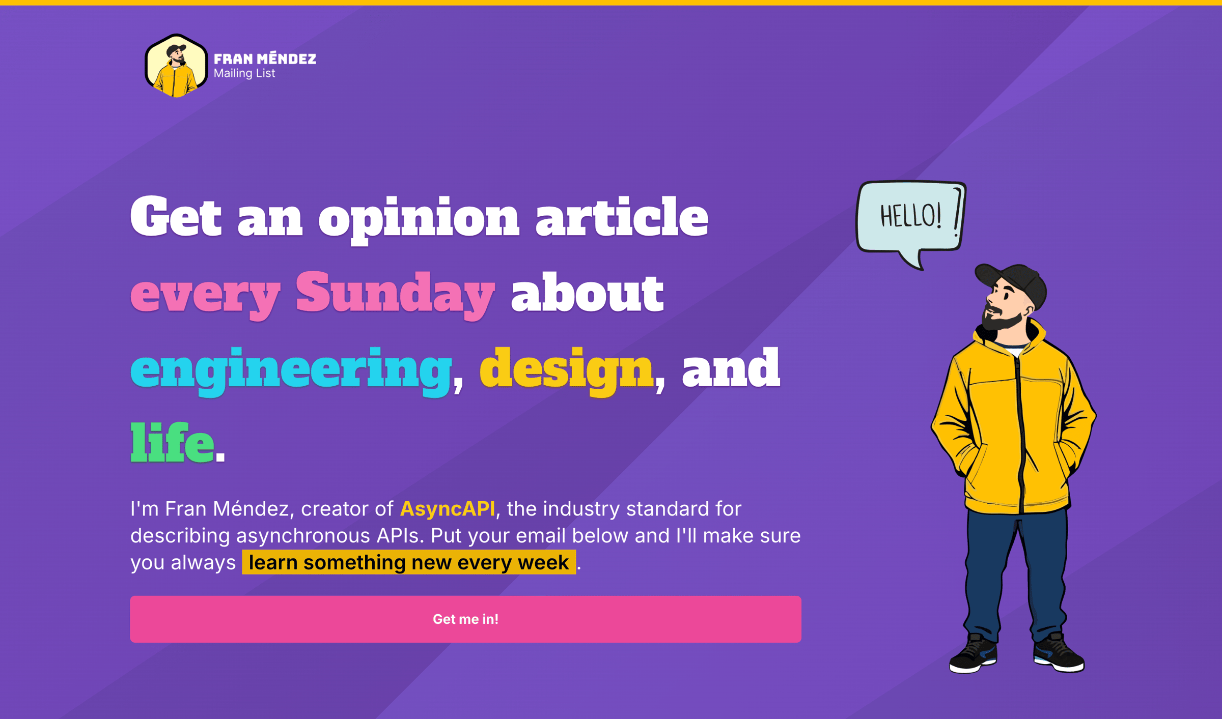 Hey hey! I'm Fran, the creator of the AsyncAPI specification (the industry standard for defining asynchronous APIs). Subscribe to my newsletter —The Weekly Shift— where I share expert advice about building Event-Driven Architecture and share my journey writing my first book, Shift: The Playbook for Event-Driven Architecture Advocacy.